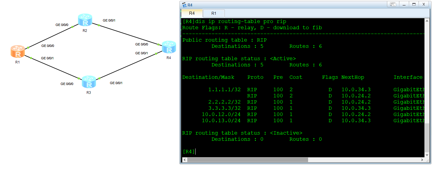在RIP路由信息协议中,R4 G0/0/1 metcirout 设置为10,在R4 运行 dis ip routing-table pro rip后,结果如下,对到1.1.1.1/32的结果有些不解,