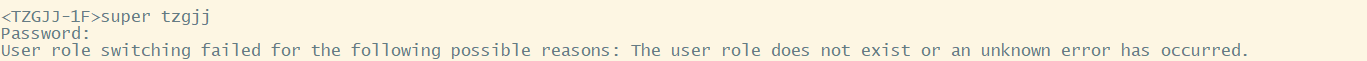 role role-name:待切换的用户角色的名称,为1~63个字符的字符串,区分大小写,可以为系统中已存在的除security-audit、guest-manager之外的任意用户角色。如果不指定角色名称,则表示设置的是切换到当前缺省目的用户角色的密码。缺省的目的用户角色由super default role命令指定。