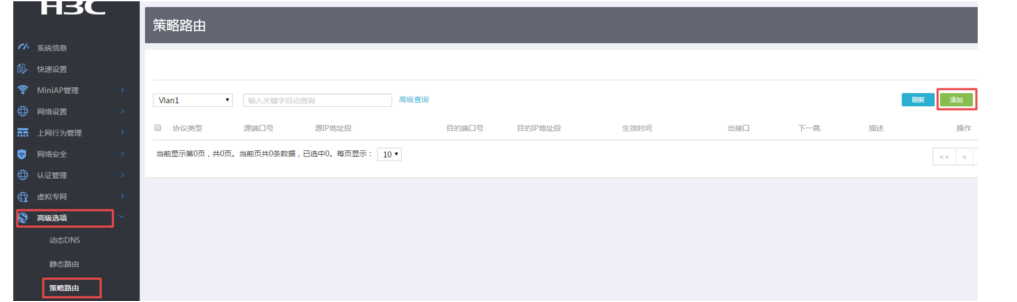 (1) 单击导航树中[高级选项/策略路由]菜单项,进入策略路由配置页面。