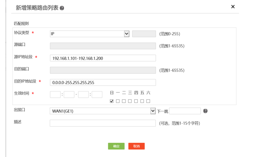 配置管理层用户区网段通过WAN1口上网的策略路由:选择协议类型为ip,源IP地址段设置为“192.168.1.101—192.168.1.200”,目的地址设置为“0.0.0.0-255.255.255.255”,出接口选择“WAN1”,生效时间可以根据现场的情况进行选择配置,配置好后点击【确定】