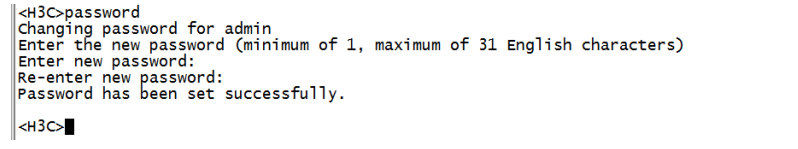 使用Consosle口登陆设备,参考【01设备管理】章节中的【1.1.1 Console方式登录设备方法】<H3C>提示进入设备命令行,输入password命令并回车,按照系统提示,提示:enter new password(输入新密码),则可以直接输入新密码,并重新输入一次确认即可。