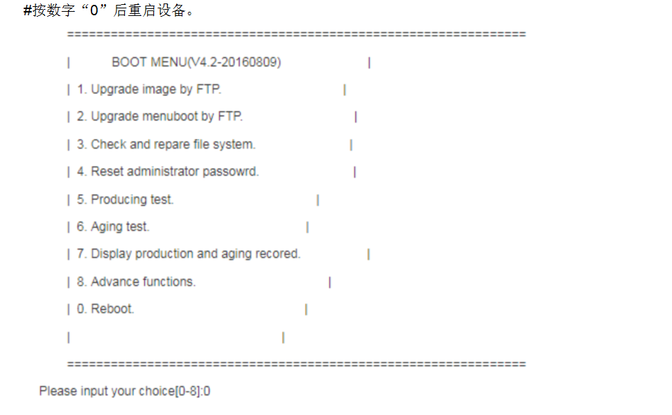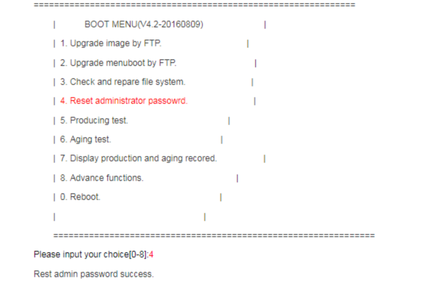 #重启设备后立即按住“ctrl+B”进入Menuboot界面,选择数字4重置管理员密码。