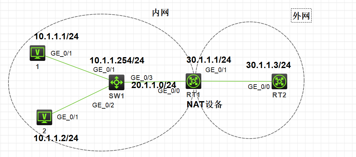 终端2想要访问服务器1,RT1的G0/0接口做了nat hairpin,G0/1接口做了nat outbound以及nat server,简单接口配置如下: