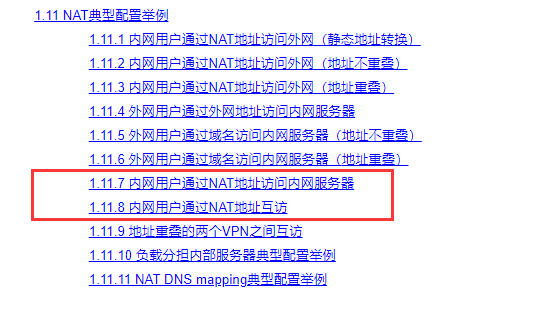 · C/S方式:NAT在内网接口上同时转换访问内网服务器的报文的源和目的IP地址,其中,目的IP地址转换通过匹配某外网接口上的内部服务器配置来完成,源地址转换通过匹配内部服务器所在接口上的出方向动态地址转换或出方向静态地址转换来完成。