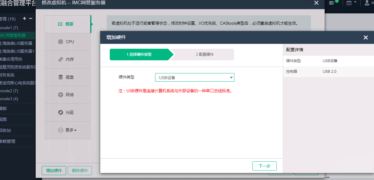 将u盘插入虚拟机所在主机服务器的usb口上,登录云平台,点击需要挂载u盘的虚拟机-修改-增加硬件-硬件类型选择usb设备-选择刚才插入的u盘设备即可。