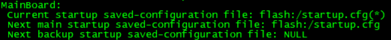 没听懂你的意思,但是你这个截出来的表项是正常的。# 显示本次及下次启动的配置文件名。 <Sysname> display startup MainBoard: Current startup saved-configuration file: flash:/startup.cfg(*) Next main startup saved-configuration file: flash:/startup.cfg Next backup startup saved-configuration file: NULL 表1-3 display startup命令显示信息描述表 字段 描述 MainBoard 主设备当前启动使用的配置文件及下次启动时使用的配置文件 Current Startup saved-configuration file 当前启动使用的配置文件 若该字段后有“*”标识,则表示当前的启动配置文件为二进制类型 Next main startup saved-configuration file 下一次启动时使用的主用配置文件 Next backup startup saved-configuration file 下一次启动时使用的备用配置文件 https://www.h3c.com/cn/d_202107/1426727_30005_0.htm#aa_104