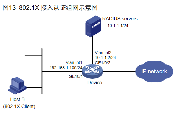 ·            由两台RADIUS服务器组成的服务器组与Device相连,其IP地址分别为10.1.1.1/24和10.1.1.2/24,使用前者作为主认证/计费服务器,使用后者作为备份认证/计费服务器。