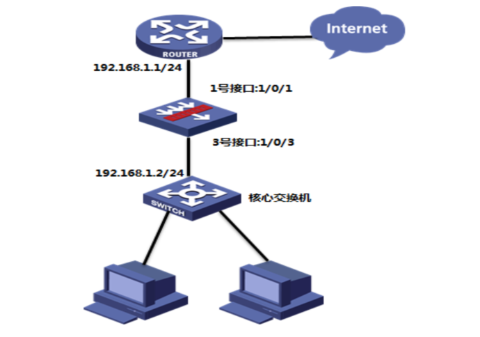 如下组网图所示,在原有的网络中增加防火墙来提高网络安全性,但又不想对原有网络配置进行改动,所以需要防火墙采用透明模式部署;其中GigabitEthernet 1/0/1接口接原有路由器的下联口,GigabitEthernet 1/0/3接口接原有的交换机上联口。