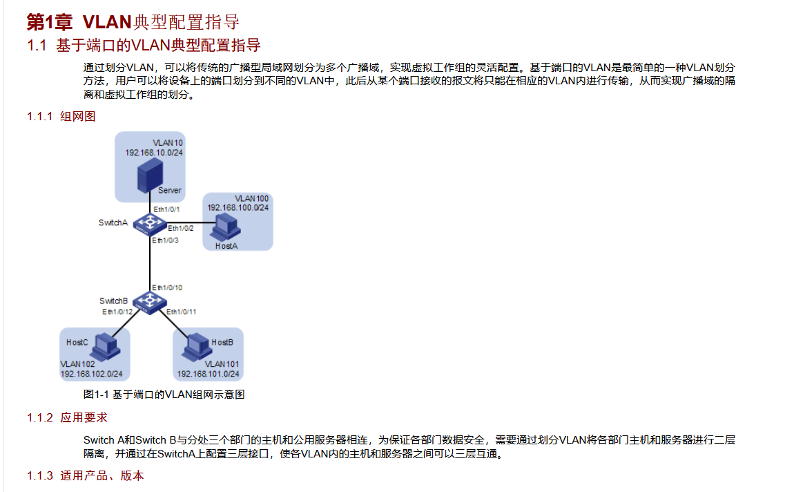 除S3600-SI/EI系列、S5600系列、E352&E328交换机可以作为图1-1的SwitchA对不同VLAN的报文进行三层转发外,表1-1中的其余款型均不支持配置多个VLAN接口来进行三层转发,只能通过创建VLAN来进行二层隔离,即作为图中的SwitchB。