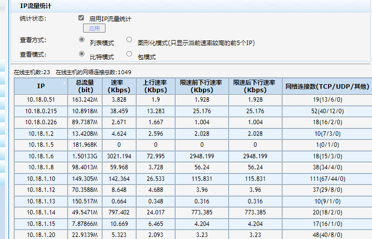 在比特模式下查看局域网内各在线主机通过WAN口的总流量、总速率、上行/下行速率及网络连接数 | |