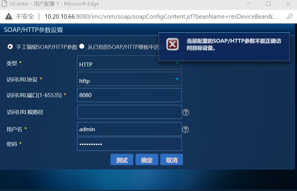 U-center要纳管UIS,在纳管虚拟化界面选择CAS选项,IP地址填集群管理IP,SOAP/HTTP参数填写正确参数无法成功检测。