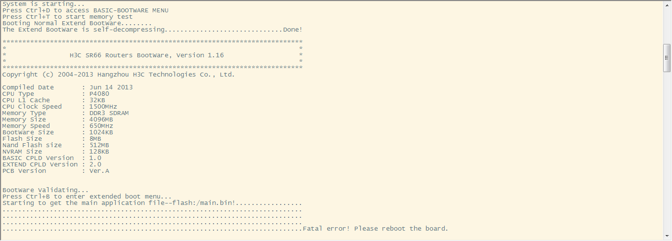 SR6602-X2路由器重启后报错Fatal error! Please reboot the board.