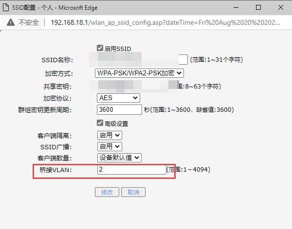 使用3C ER3200G2 路由器管理的AP,设置了2个SSID,其中一个桥接VLAN1,正常使用,另一个桥接VLAN2,无法获得IP地址,