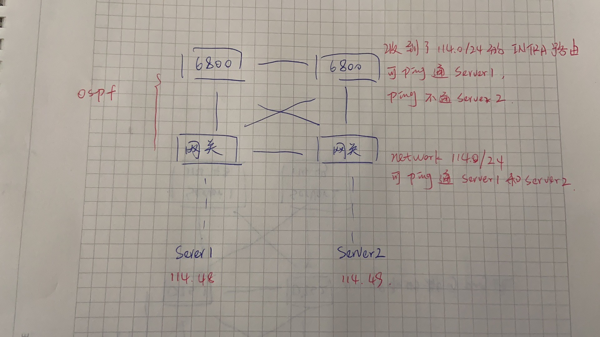 检查发现,网关交换机上ping通了两台服务器,并且向S6800交换机 network 了114.0/24。
