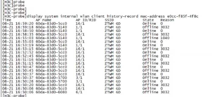 [H3C-probe]display system internal wlan client history-record help reason-code 3032 Client RSSI was lower than the threshold and was decreasing.