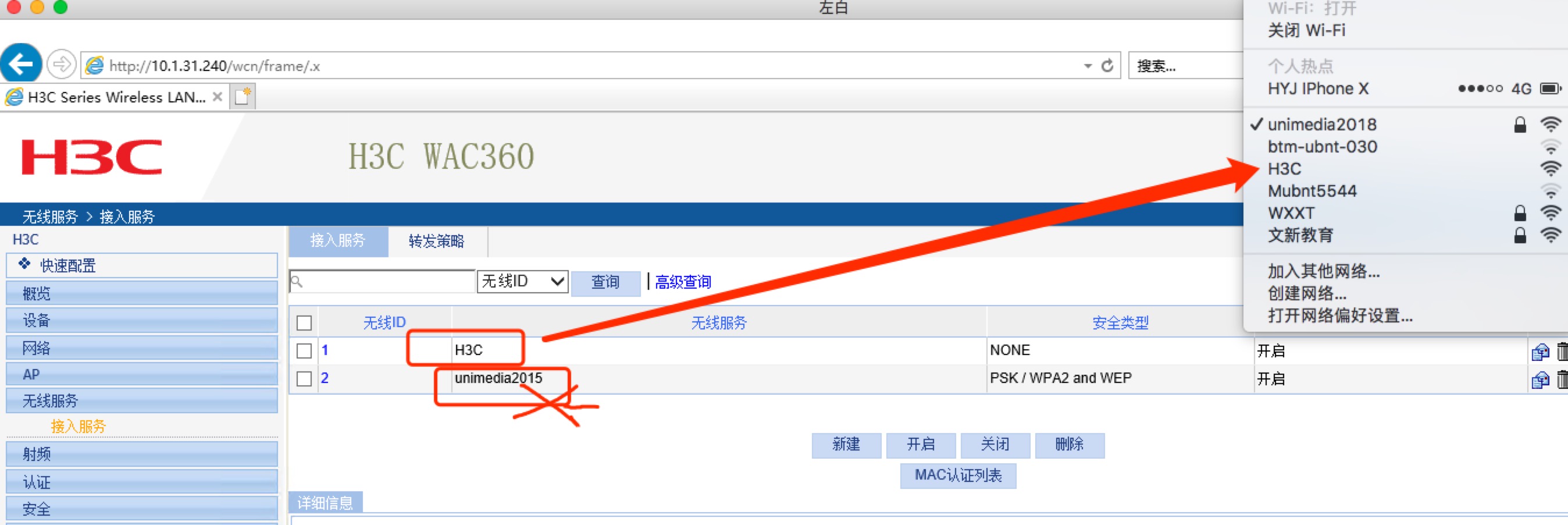 搬家重新初始化了 H3C WAC360的AC控制器, 设置好 无线服务后 在电脑上搜不到 设置的接入服务。系统默认的 无密码接入是正常的。 配置如下图