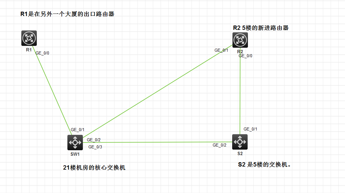 现在公司里面想两个路由器之间互访。情况是这样的,有一台路由器不在公司里面,是在另外一个大厦里面,这个大厦只有一个核心交换机。现在在其他楼层进入了一台路由器和一条外线。如何不破坏之前的网络环境,之前的核心交换和新进的路由器连接起来。做到2个外线可以互访。下面模拟器的连接方法是否可行。需要跑什么协议。