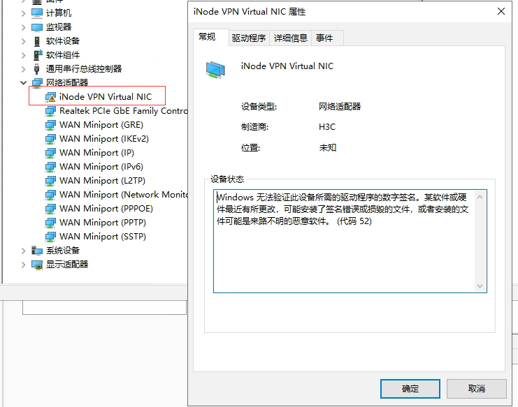 iNodeSetup7.3 (E0548).exe在WindowsServer2019安装后驱动无法正常工作(如下图,WIndows无法验证此设备所需的驱动程序的数字签名,带黄色三角警告图标)。