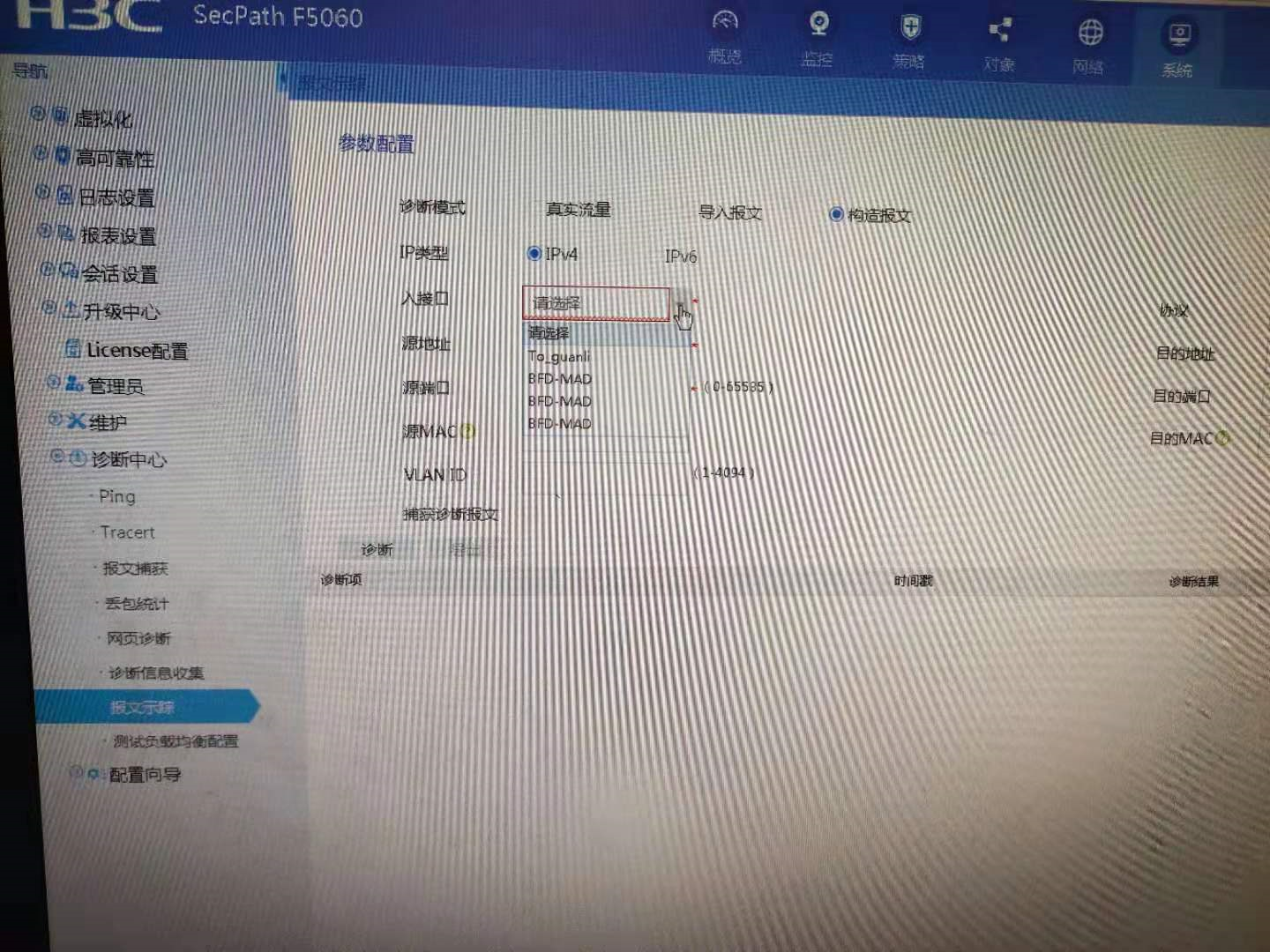 H3C-F5060防火墙部署模式是透明模式,接口二层接口,一个trust域,一个untrust域,在系统---->报文跟踪---->构造报文的时候,写入接口的时候为什么不能选? 这是为什么?