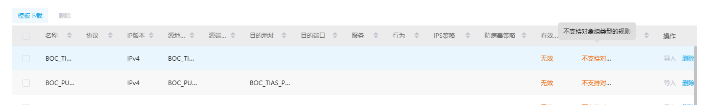 CloudOS平台上,添加防火墙策略时,显示不支持对象组类型的规则,因为我是用模板批量下发,只有少部分出现错误,核对发现和其他支持的没啥区别;