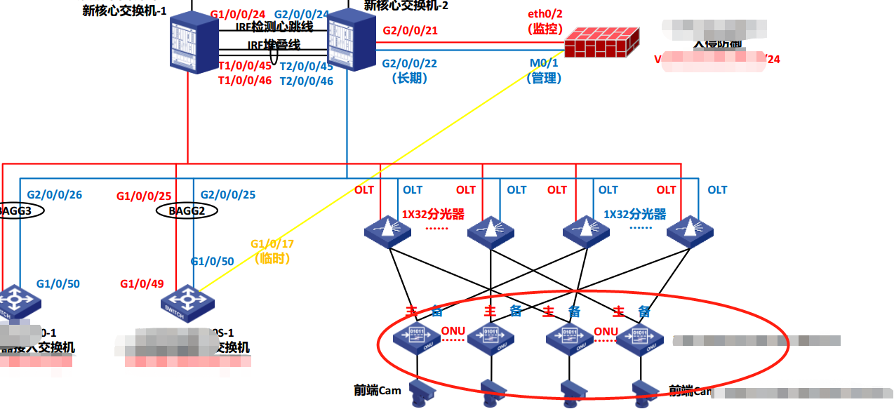 1.S7506E核心交换机做IRF堆叠,每台主机配1块EPON板卡,使用1分32分光器互联下面的ONU设备,