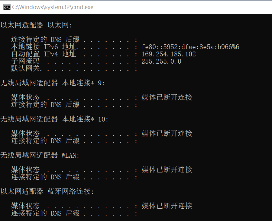 通过ipconfig查看本机IP是:169.254.185.102,但是始终无法找到管理IP地址。