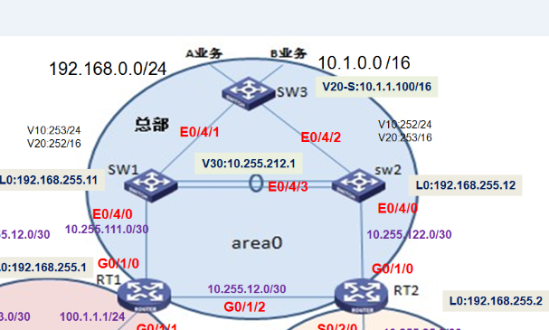 要不你就把sw3作为三层来用,vlan10和vlan20是上行AB业务vlan,下联的vlan换成30和40,起interface vlan-interface 10、20、30、40,vlan30和40作为和下行设备建立ospf邻居的接口,在ospf的area下引入vlan 10和vlan 20的网段发布出去