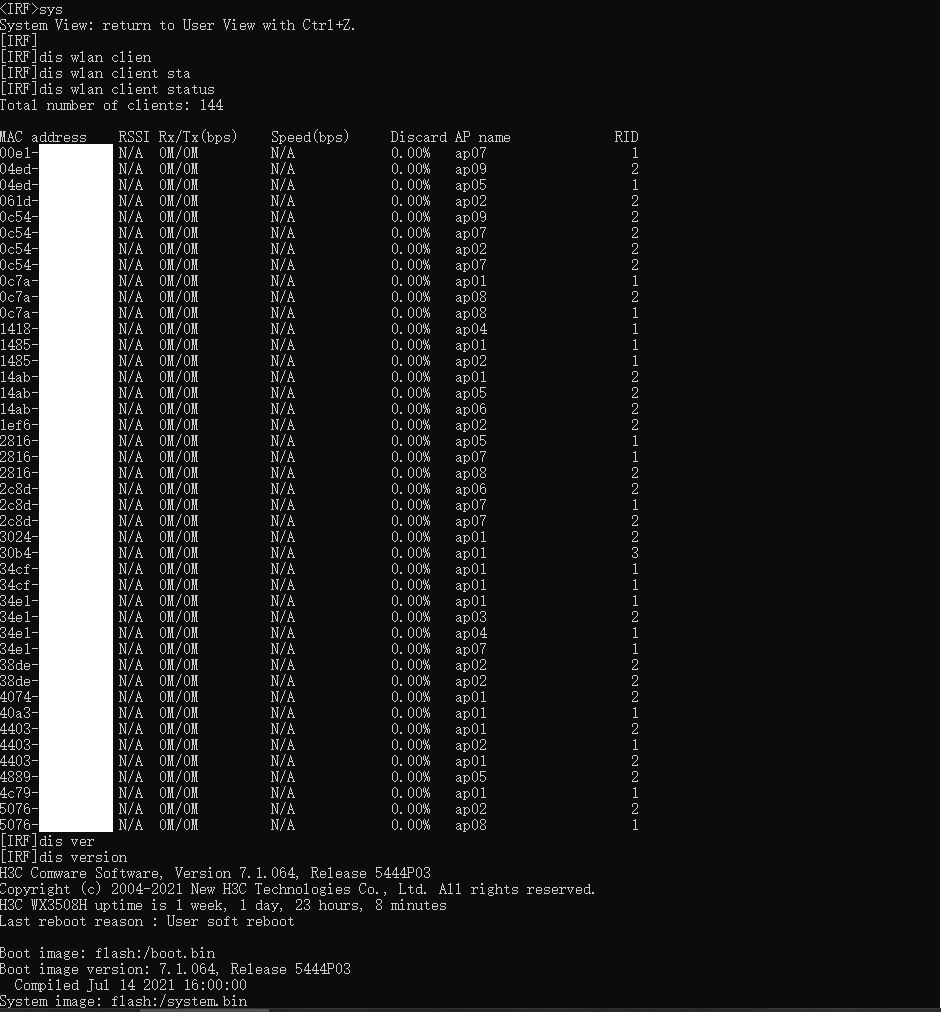 WX3508H升级到最新的R5444P03固件后,参数无法显示,例如dis wlan client status,请问是什么原因?