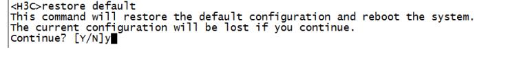 进入命令行之后,输入restore default,按照提示输入Y,之后设备会自动重启,重启后,就恢复出厂设置了。