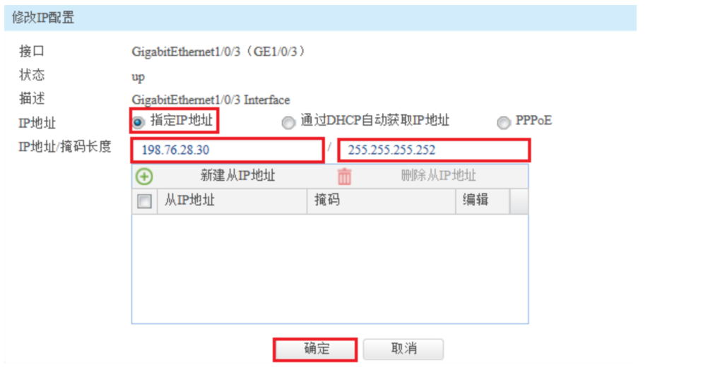 #“IP地址”填写运营商给的公网地址198.76.28.30,掩码为255.255.255.252。