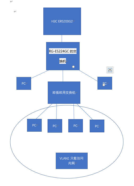 路由器下面接了一个锐捷的RG-ES224GC的交换机,交换机直接接了pc电脑,现在我把需要划分到一个VLAN的pc统一接着一个无网管功能的交换机上,上层设备是锐捷的交换机。我想咨询下路由器ER5200G2能不能实现划分VLAN后其中一个VLAN只能访问内网 拓扑如下图