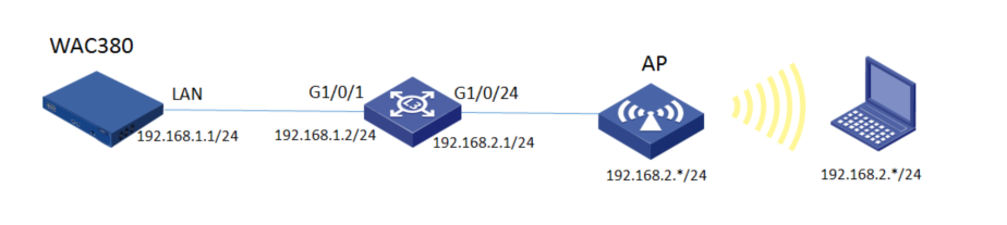当AP的管理地址与AC的LAN口地址不在同一个网段时,我们称之为三层注册。本案例介绍通过命令行给WAC380 配置AP三层注册,配置无线加密,同时使用WAC380给下联的AP和无线客户端分配192.168.2.0/24的地址。
