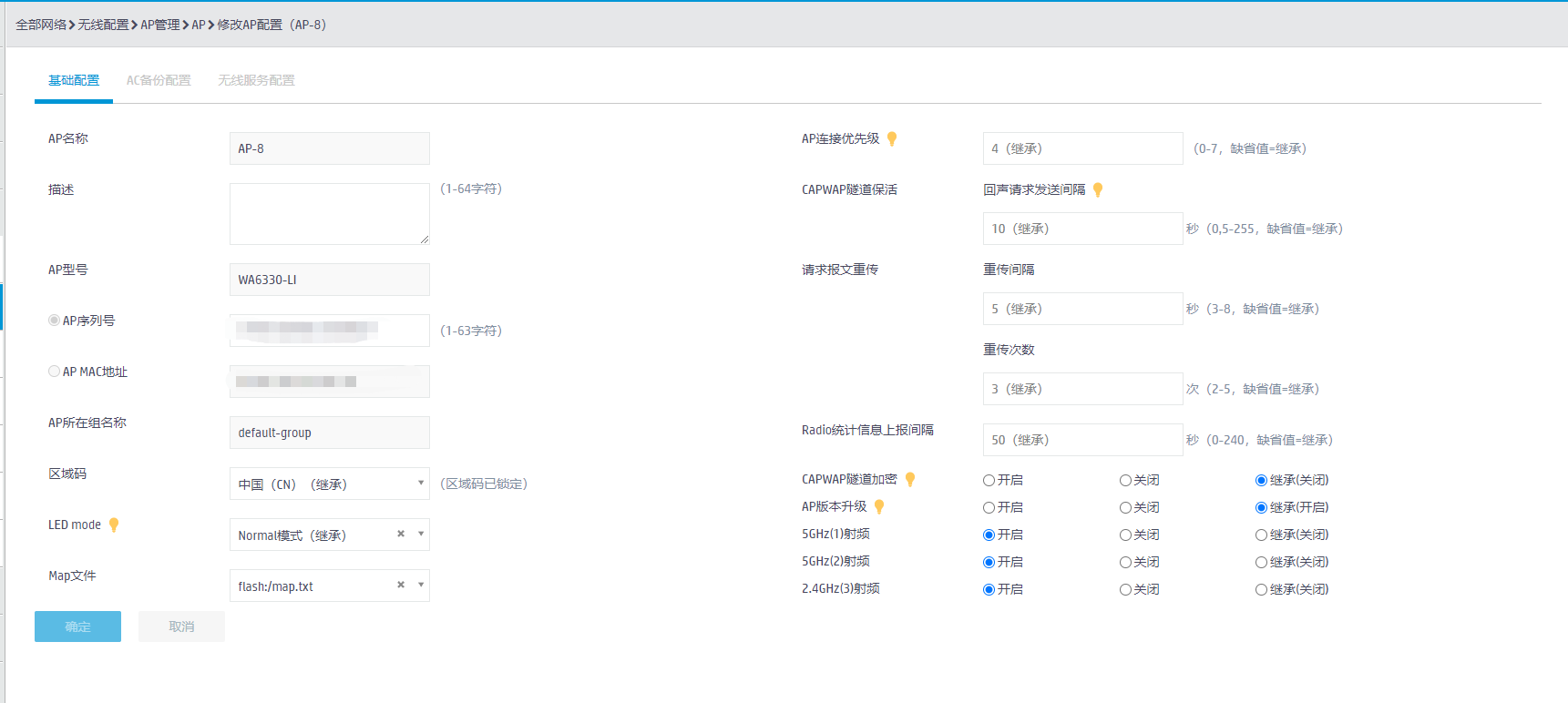 我们公司用的是WX2510H-F这个AC关联无线网络,之前用的是WA4320i-ACN的无线ap,现在我们添加了一个WA6330-LI的ap,ap接上了之后,AC添加设备,各项设置跟原来的WA4320i-ACN都是设置一样的,自动固定的ap,现在的问题是设备连不上这个ap的无线网络,设备连接的时候一直提示获取IP地址中,不能获取ip地址,AP上的灯一直闪蓝灯