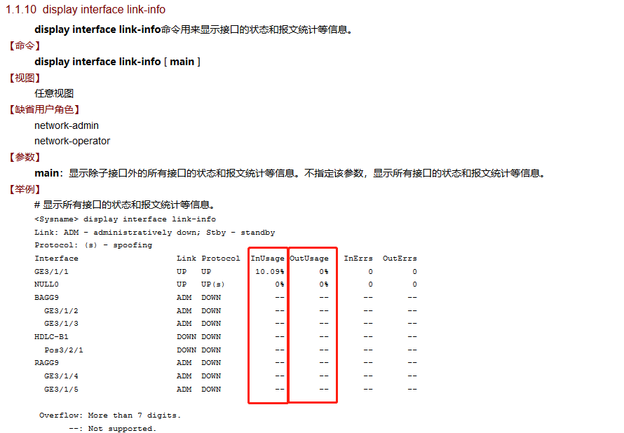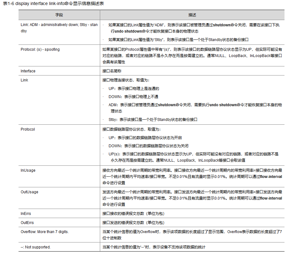 display interface link-info命令用来显示接口的状态和报文统计等信息查看。可以看到进出接口的流量;inusage代表进来的流量速率