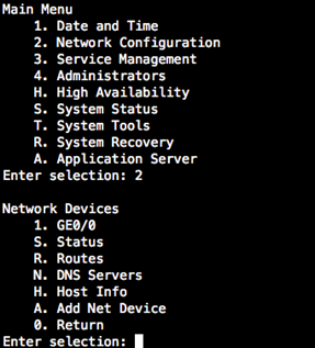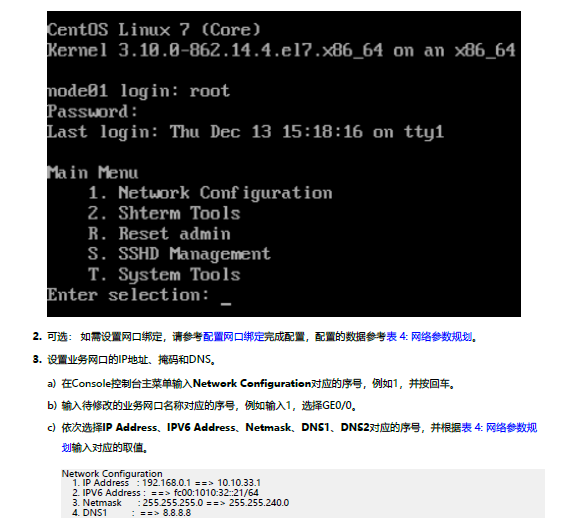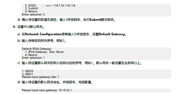 # 选择相应的配置项编号即可修改该配置参数,例如:选择1(IP Address),修改该网卡的ip地址,回车之后菜单中会提示您新设置的IP地址,确认没问题之后选择S(submit)进行提交生效。