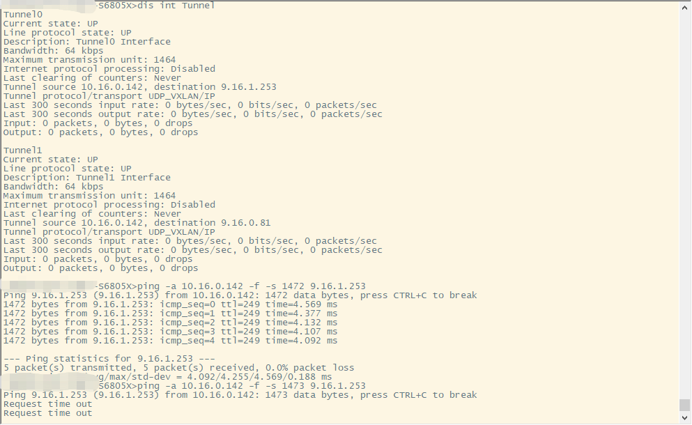 evpn_vxlan组网已完成,普通ping测正常,普通协议正常,如ssh、telnet,但ping测试大包时,发现同网段vxlan流量ping测不通、不同网段的vxlan流量正常。附ping测结果及evpn的表项,测试结果显示最大可通过MTU为1422,超过1422的报文都无法进行转发。