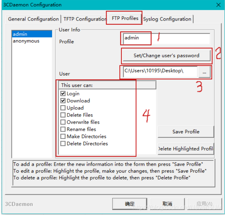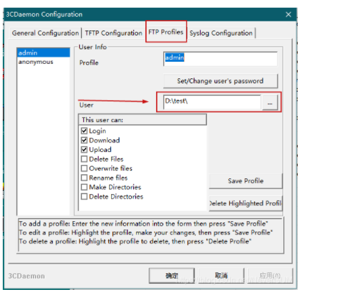①:这里的用户名可以随便新建,以后在交换机登录到这个FTP客户端需要输入这个用户名