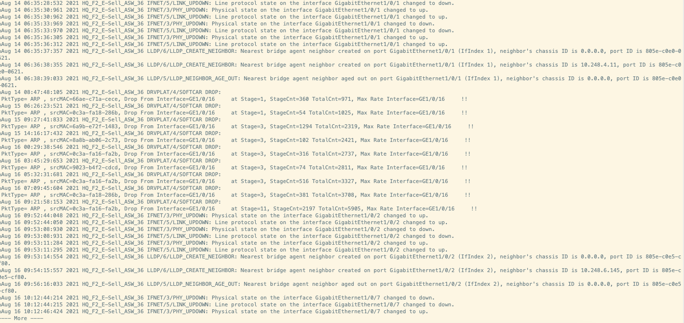%Aug 4 04:21:34:233 2021 HQ_F2_E-Sell_ASW_36 DRVPLAT/4/SOFTCAR DROP: PktType= ARP , srcMAC=d630-f66c-cd2f, Drop From Interface=GE1/0/16 at Stage=59, StageCnt=236 TotalCnt=6817, Max Rate Interface=GE1/0/16 !!