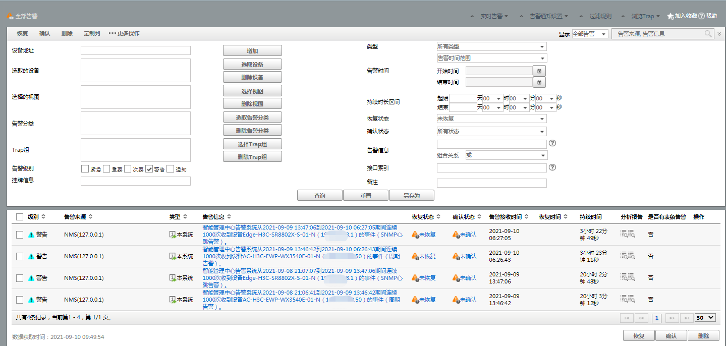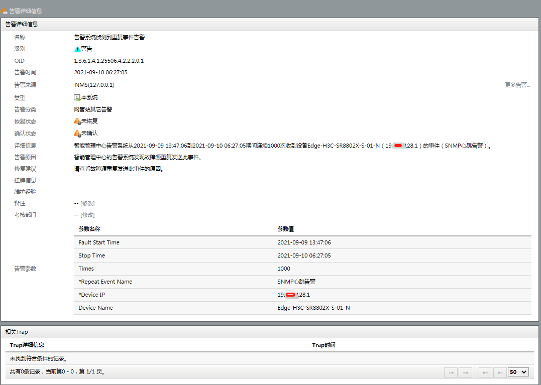 没有snmp日志告警,网络中除了SR88,还有一台AC WX3540E也会产生同样的告警,登录这2台设备均查询不到关于snmp协议的相关日志。 iMC没有配置阈值1000次之前,默认是100次的时候,普通的二层交换机和核心交换机也会产生相同的snmp心跳告警。关键是这个告警让人一头雾水。
