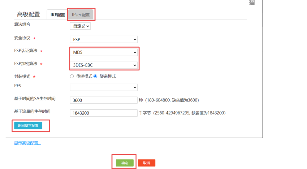 #配置IPsec,安全协议选择【ESP】,认证算法选择【MD5】,加密算法选择【3DES-CBC】,并保证两端算法一致。然后点击【返回基本配置】,再点击【确定】