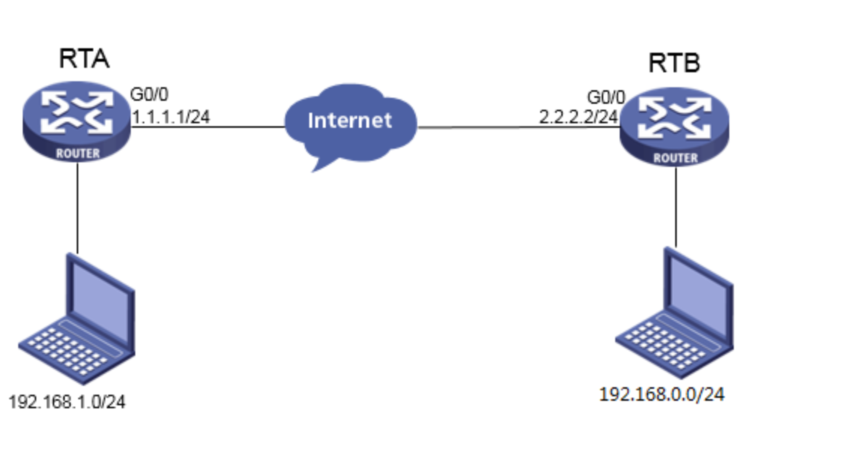 Router A使用ERG2路由器,Router B均使用MER路由器,在两者之间建立一个安全隧道,对客户分支机构A所在的子网(192.168.1.0/24)与客户分支机构B所在的子网(192.168.0.0/24)之间的数据流进行安全保护,实现两端子网终端通过IPsec VPN 隧道进行互访。并且MSRV5路由器是不固定的IP地址。