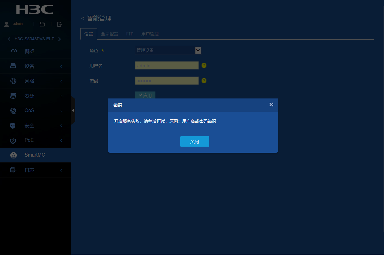 # 配置FTP服务器信息,指定FTP服务器的IP为192.168.2.1,用户名为admin,明文密码为admin。