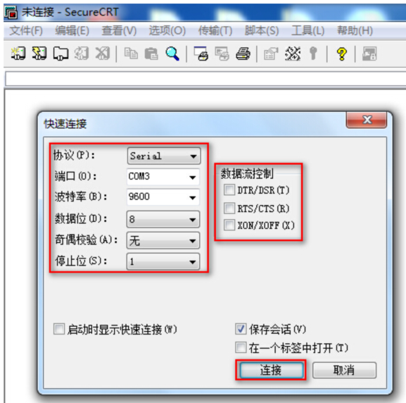 双击运行SecureCRT软件,找到【文件】菜单下【快速连接】选项,如下图,协议选Serial,端口选com3,波特率为9600,数据位为8,奇偶校验无,停止位为1,最后点击【连接】。