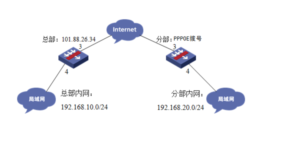 总部和分部各有一台防火墙部署在互联网出口,因业务需要两端内网需要通过VPN相互访问。IP地址及接口规划如下表所示: