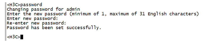 使用Consosle口登陆设备,参考【01设备管理】章节中的【1.1.1 Console方式登录设备方法】<H3C>提示进入设备命令行,输入password命令并回车,按照系统提示,提示:enter new password(输入新密码),则可以直接输入新密码,并重新输入一次确认即可。