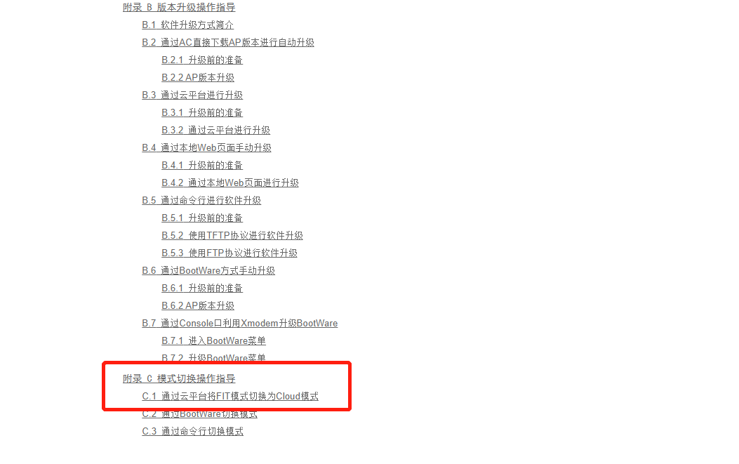 通过配置终端进入设备的命令行界面,在系统视图下输入ap-mode { anchor-ac | cloud | fit }命令来切换AP的工作模式。AP重启后将使用出厂配置或上次切换为该模式时保存的配置。
