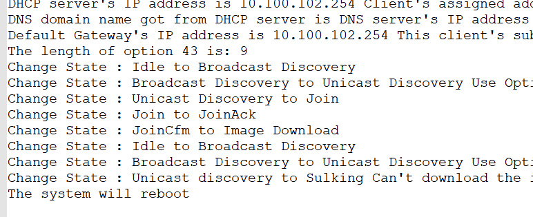 The system image does not exist! Loading the backup boot and system image files... The image does not exist! Booting image fails! Trying to get the IP address from the DHCP server...... DHCP server's IP address is 10.100.102.254 Client's assigned address is 10.100.102.40 DNS domain name got from DHCP server is DNS server's IP address is 0.0.0.0 Default Gateway's IP address is 10.100.102.254 This client's subnet mask is 255.255.255.0 The length of option 43 is: 9 Change State : Idle to Broadcast Discovery Change State : Broadcast Discovery to Unicast Discovery Use Option 43: Getting AC's IP Address 10.100.103.254 Change State : Unicast Discovery to Join Change State : Join to JoinAck Change State : JoinCfm to Image Download Change State : Idle to Broadcast Discovery Change State : Broadcast Discovery to Unicast Discovery Use Option 43: Getting AC's IP Address 10.100.103.254 Change State : Unicast discovery to Sulking Can't download the image from network, please check the network settings The system will reboot