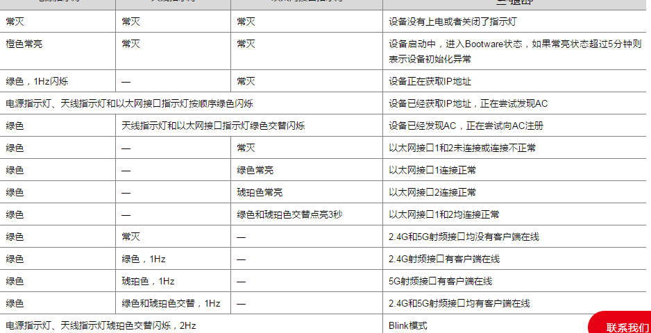 绿色 | 常亮 | 设备已经启动完成并已经注册到AC,正处于待机状态(无客户端在线) | |