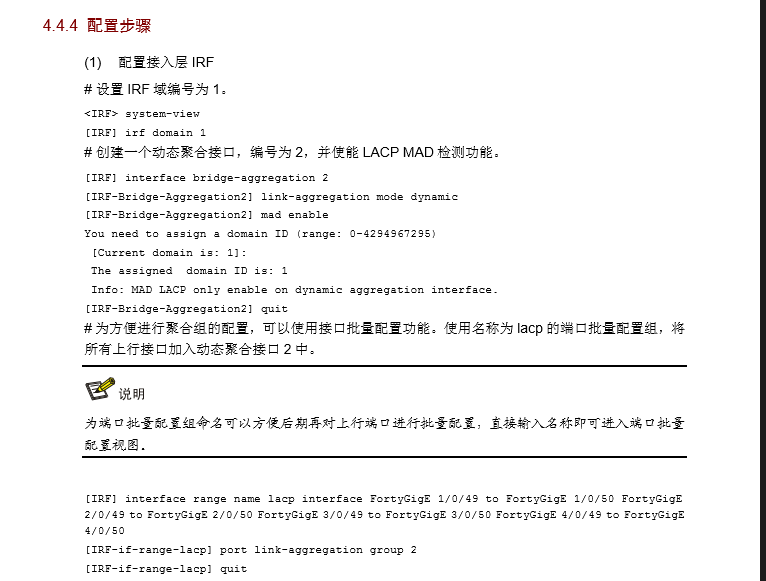 案例的意思:下层四个接入交换做了堆叠,将8个口配置在一个聚合组内。上面汇聚层,是两两做堆叠,将8个口分配两个接口范围内加入聚合组。