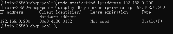 DHCP地址池中做了IP+MAC 动态分配地址绑定,现在想删除绑定,重新分配。删除命令是提示成功了,但不起作用。帮忙看看大神们。谢谢